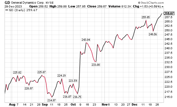 In other General Dynamics business segments, Willian Blair expects several yet-unannounced large contract awards for General Dynamics IT, to go along with C$1.7 billion, or US$1.29 billion, in General Dynamics Mission Systems contracts that were announced on Dec. 20 for the Canadian Army. General Dynamics shares are poised to have a strong 2024, William Blair wrote.