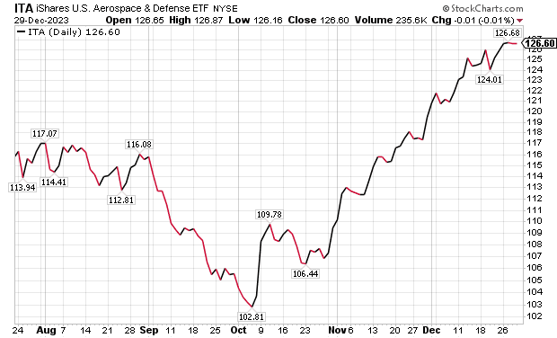 ITA is up 14.34% during the last 12 months, 19.88% for the last three months and 5.99% in the last month. Its dividend yield is 1.4%.