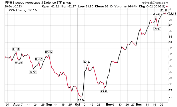 The fund is up 18.41% for the past year, 15.83% in the last three months and 5.09% during the past month. PPA’s dividend yield recently touched 0.7%.