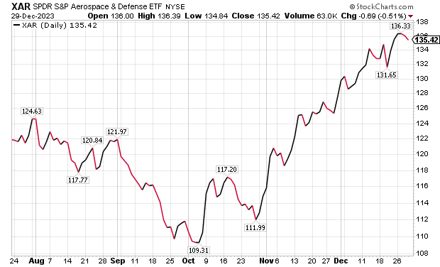 A fourth way to obtain dividends from defense and aerospace investments is through SPDR S&P Aerospace and Defense ETF (XAR). That exchange-traded fund tracks the S&P Aerospace & Defense Select Industry Index. The fund is overweight in industrials and underweight in technology and consumer cyclicals, said Bob Carlson, a pension fund chairman who heads the Retirement Watch investment newsletter.