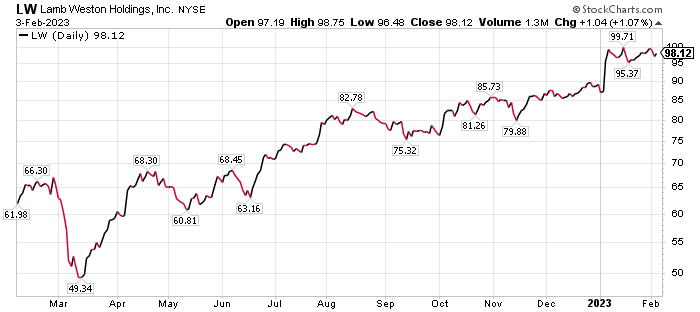 Bryan Perry, the leader of the Cash Machine investment newsletter and the Breakout Options Alert trading service, recommended Lamb Weston call options in the latter service. The trade is almost up by 10% since the recommendation and the stock is up 11.78% so far this year.