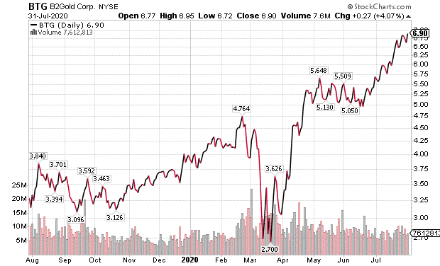 Skousen recommended that his Forecasts & Strategies investment newsletter subscribers buy B2Gold (NYSE:BTG). He previously predicted gold would reach $2,000 by year-end and it now looks like it will rise well beyond that mark.