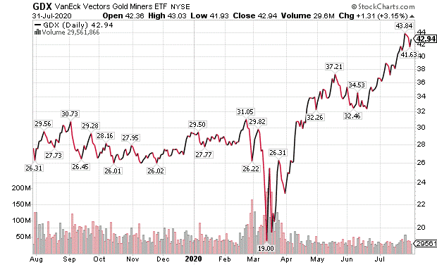 Big gains also flowed from VanEck Vectors Gold Miners ETF (GDX). The mining stocks that make up this ETF have been surging. GDX rose 17.07% in the last month, 46.65% for the year to date and 63.15% for the past year. Plus, GDX offers a current dividend yield of 0.52%.