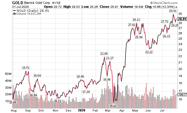 Toronto-based Barrick Gold Corp. (NYSE: GOLD), the second-largest mining company in the United States, became a recent recommendation in the Five Star Trader advisory service and it gained 38.59% in just under two months before an order to take profits came from its leader Mark Skousen, PhD, a Presidential Fellow at Chapman University. Skousen, named one of the 20 most influential living economists and the recipient of the inaugural Triple Crown in Economics award in 2018, also advised the purchase of Sept. 18 $20 call options in Barrick Gold before choosing to sell them in three segments for a 118.49% gain on half, 213.20% on a quarter and 161.50% on the remainder to average 152.92% in 49 days.