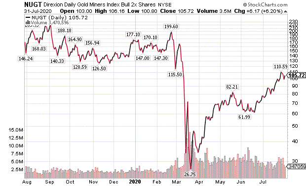 NUGT is double leveraged with the plan of rising twice as much as the gold miners index. NUGT previously had been tripled leveraged but the fund scaled back to double leveraged as gold surged. The leverage turns NUGT into a volatile investment that can jump as it did when rising 35.23% in the past month or plunge as occurred when falling 39.31% year to date and 27.74% for the last year. As a bonus, NUGT pays a current dividend yield of 0.91%.
