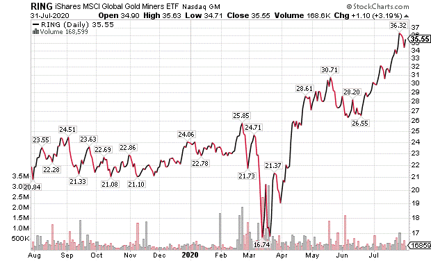 RING is an ETF that features an array of major gold stocks. Investors who buy shares in RING can gain exposure throughout the sector by investing in just one fund.