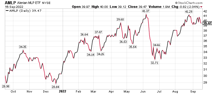 Bryan Perry, who leads the Cash Machine investment newsletter, proposes investing in energy through the Alerian MLP Exchange Traded Fund (NYSE: AMLP). That fund seeks investment results that correspond generally to the price and yield performance of the Alerian MLP Infrastructure Index. The index is a capped, float-adjusted, capitalization-weighted composite of energy infrastructure Master Limited Partnerships (MLPs) that earn most of their cash flow from midstream activities such as the transportation, storage and processing of energy commodities.
