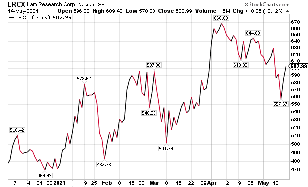 BoA assigned Lam Research a $725 price target, based on 20x cash adjusted 2022 estimated P/E, within the stock’s historical range of 8x-24x and based on LRCX’s 20%-plus EPS growth rate. Amid a multi-year wafer fabrication equipment growth cycle, LRCX is well positioned to benefit, the investment firm wrote.