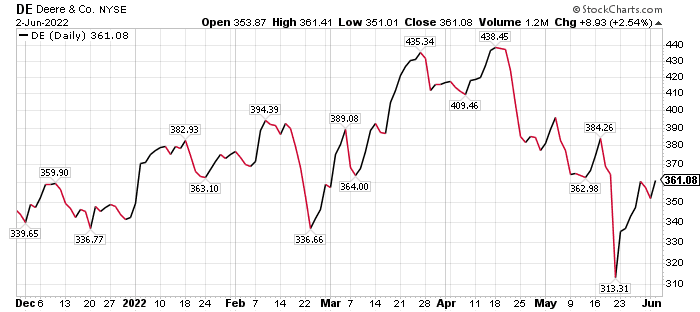 Farm machinery company Deere (NYSE: DE), of Moline, Illinois, offers an inflation hedge in the agricultural field. The stock’s double-digit-percentage share price drop after it recently reported earnings offers a discounted entry opportunity, Connell said.