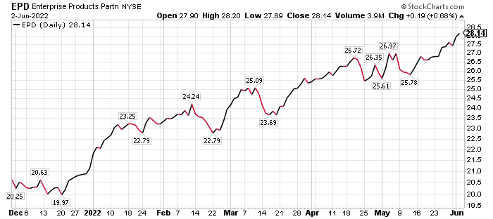Investors can profit from the continuing rise of oil prices by purchasing shares of Houston-based Enterprise Products Partners (NYSE: EPD). The oil producer’s stock has soared more than 32.38% year to date through the close of trading on Thursday, June 2, to rank as the “best performer” during that time in the Forecasts & Strategies investment newsletter led by Mark Skousen, PhD.