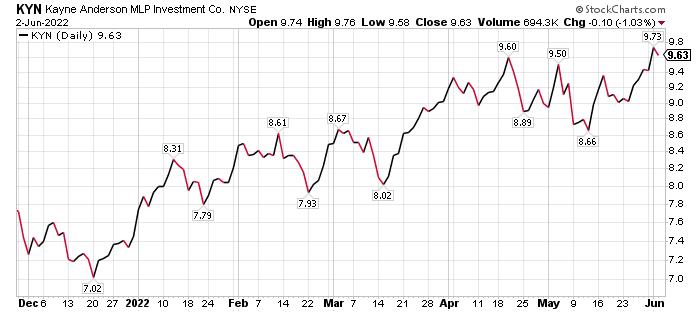 Kayne Anderson MLP Investment Co. (NYSE: KYN) has jumped 3.44% in the last week, 7.72% in the past month, 11.06% in the past three months, 29.11% so far in 2022 and 24.93% in the past year, as of the close of trading on June 2.