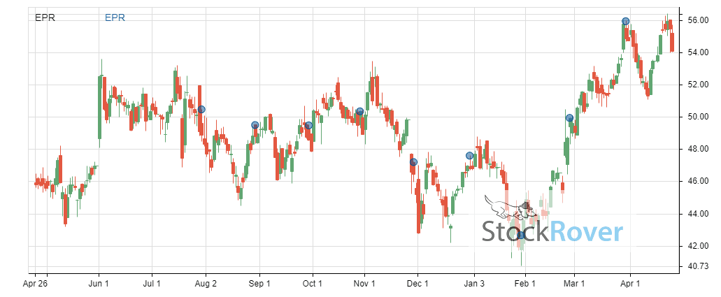 After adjusting for dividends, EPR has grown an impressive 18.7% in the trailing 12-month period, making a nearly full recovery from the March 2020 plummet.