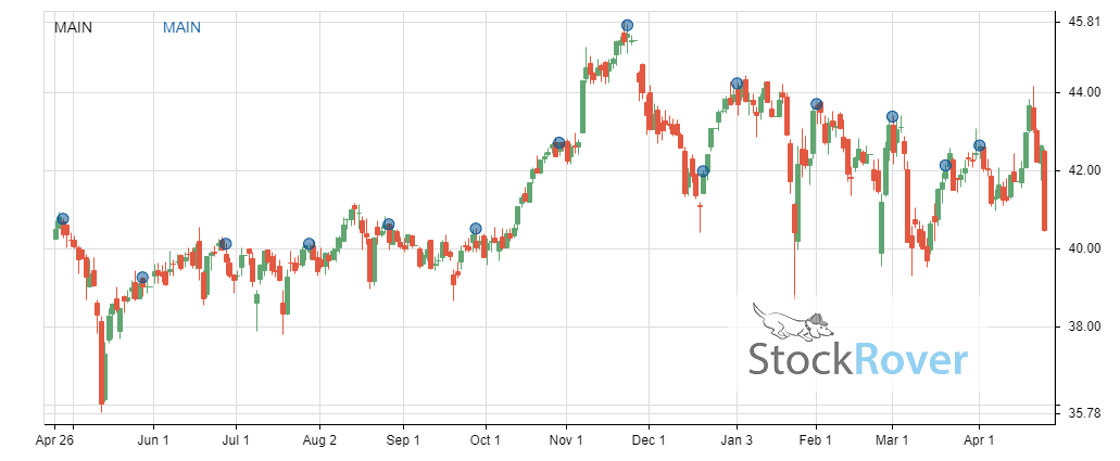 After adjusting for dividends, the returns of MAIN have stay mostly level in the last 12 months, with investors seeing a positive annual return of 0.5%. That said, returns have been much higher over the last 5 years, having rewarded investors with 44.2% growth.