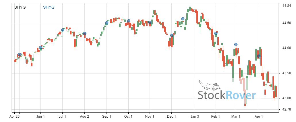 Shown below are the dividend adjusted returns for the last 12 months. Blue circles indicate dividend distributions.