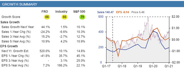 Although the stock has seen a negative change in sales and earnings per share (EPS) over the trailing one-year period — dropping 24.2% and 41.8%, respectively — some of the Wall Street analysts covering Frontline have revised their earnings projections upward in the last month. With projected sales growth of 44.1% in the next year, analysts and institutional investors are becoming increasingly bullish about the shipping company.