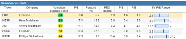 Equally notable are the valuation metrics when compared to other companies in its sector. Frontline sits in first place again, just surpassing Hess Midstream (NYSE:HESM) with a less expensive price-to-earnings (P/E) ratio and projected forward P/E ratio.
