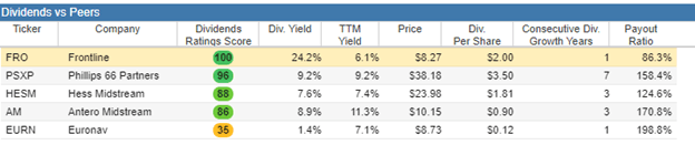 As a result, we’ve opted to exclude those dividend stocks that show artificially inflated yields due to a plummet in a company’s value. Among companies with positive yearly returns — making the dividend yield “genuine” — none of Frontline’s peers come close to its massive 24.2% yield.