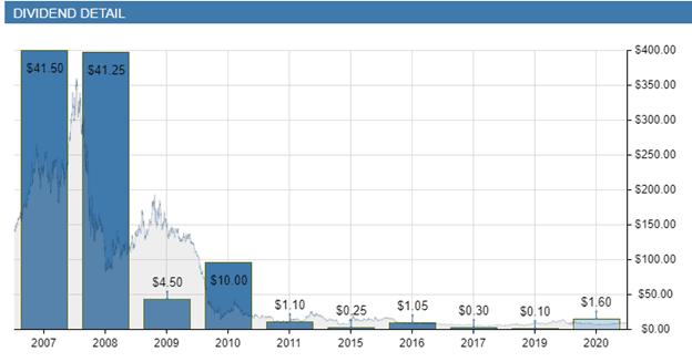 Shown below is the company’s history for dividend distributions relative to stock price over the last 14 years. A big drop occurred in dividend payouts after 2007 and 2008, then again after 2010, 2011 and 2016. No dividend payouts occurred 2012- 2014.