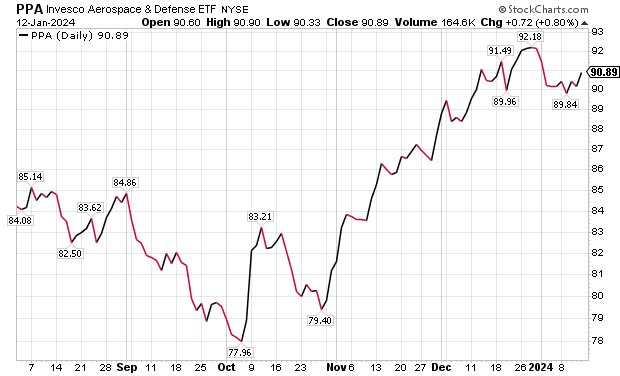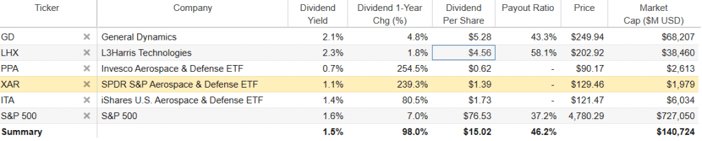PPA recently held 52 securities and 53.2% of the fund was in its 10 largest positions. With so many holdings, the fund offers reduced risk compared to buying individual stocks. The biggest positions in the fund recently were Boeing (NYSE: BA), RTX Corp. (NYSE: RTX), Lockheed Martin (NYSE: LMT), Northrop Grumman (NYSE: NOC) and General Electric (NYSE:GE). The fund’s currrent dividend yield is 0.7%.