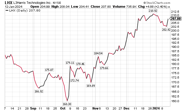 Connell also told me she also likes L3Harris Technologies Inc. (NYSE: LHX), but suggests buying after a pullback that she expects to occur. L3Harris is one of the defense companies most impacted by supply chain constraints, so it is not without risk.
