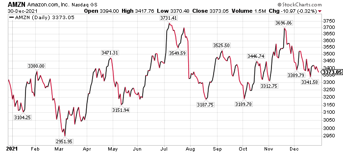 BofA rated Amazon.com as the top choice for 2022 among the FANG stocks of Meta Platforms Inc. (NASDAQ: FB), formerly Facebook; Amazon; Netflix Inc. (NASDAQ: NFLX); and Alphabet (NASDAQ: GOOGL). One reason is that Amazon underperformed in 2021 but it may be poised for a comeback.