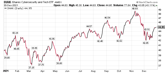 IHAK is up 3.96% in the last three months, 11.98% so far this year and 12.03% in the past 12 months through Dec. 29. The fund did even better in 2020 by soaring 51.21%.