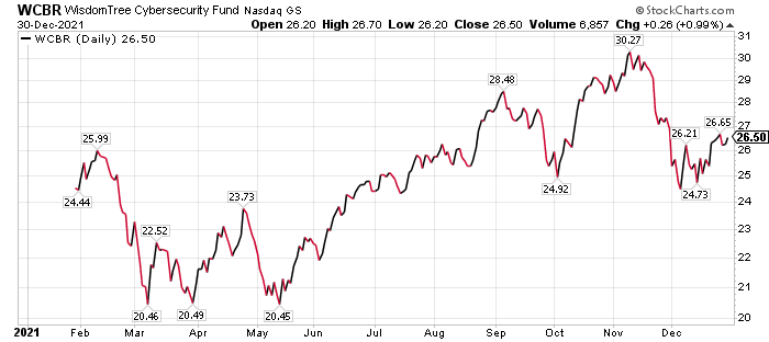 The three largest holdings and weightings in the fund feature Datadog Inc., 6.96%; Palo Alto Networks Inc., 6.37%; and Cloudflare Inc., 5.55%. Those three stocks have produced gains of 81.67%, 58.23% and 74.48%, respectively, during the past year through Dec. 29.