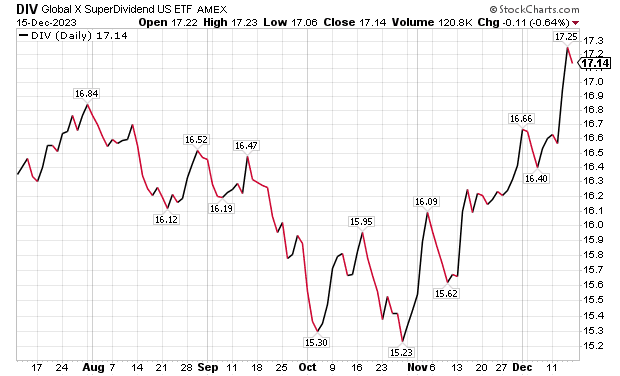 Top holdings in the DIV portfolio are Iron Mountain (NYSE: IRM), International Business Machines Corporation (NYSE: IBM), Universal Corp. (NYSE: UVV), USA Compression Partners LP (NYSE: USAC) and Cross America Partners LP (NYSE: CAPL). As of Dec. 14, DIV has dipped 2.53% year to date and 3.26% in the last 12 months, while climbing 5.04% in the past three months and 5.50% in the last month.