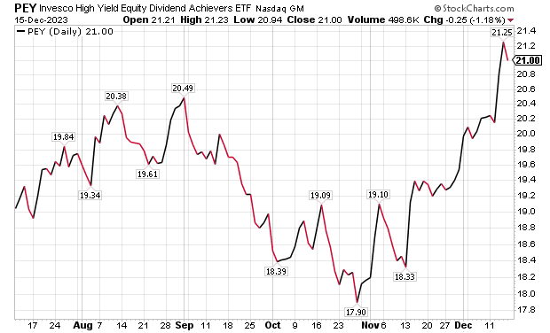 PEY’s top holdings feature Universal Corp (NYSE: UVV), KeyCorp (NYSE: KEY), Altria Group Inc. (NYSE: MO), Verizon Communications (NYSE: VZ) and Trust Financial Group (NYSE: TFC). As of Dec. 14, PEY has climbed 8.25% in the last month, 5.70% in the past three months, 5.97% year to date and 6.47% for the past 12 months.
