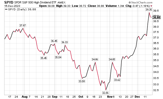 Jim Woods, who heads the Successful Investing newsletter, recently wrote favorably about SPYD. He is known for using technical analysis for signaling when to be buying and selling stocks based on the market’s current movements.