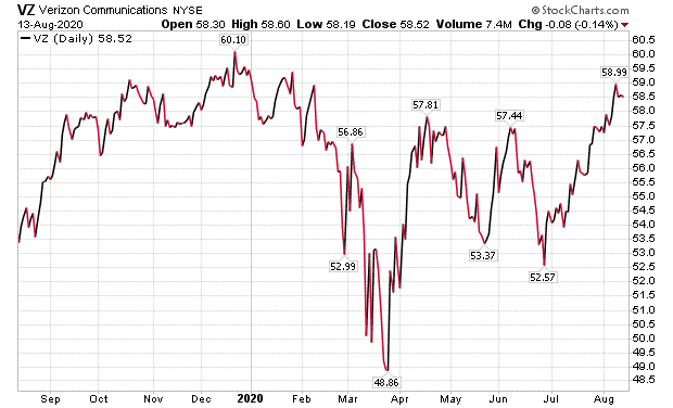 “I wouldn’t call Verizon COVID-19-proof, but I do think it’s a good stock to be holding now,” Carlson said. “The company has steady cash flow that increases over time. It also has a history of increasing its dividend. So, an income investor will see the annual income in dividends increase, regardless of what is happening with the stock price.”
