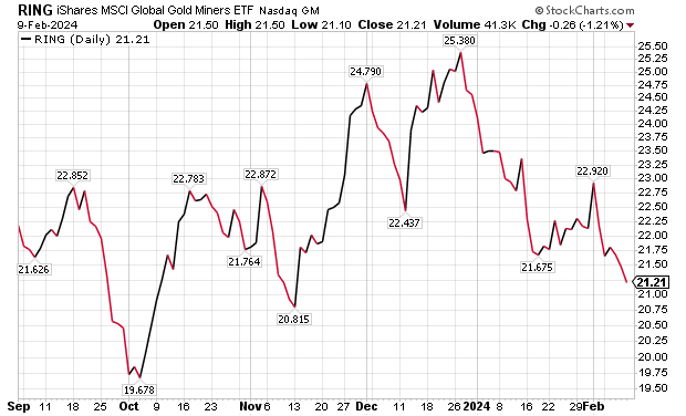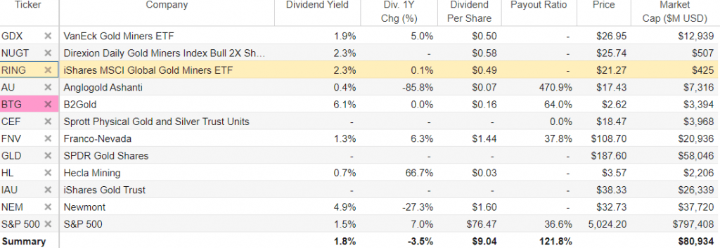 A third dividend-paying gold fund to purchase for income is the iShares MSCI Global Gold Miners ETF (NASDAQ: RING), which seeks to track the investment results of an index composed of global equities of companies primarily engaged in the business of gold mining. RING is another dividend-paying ETF that aims to focus on the largest mining stocks.