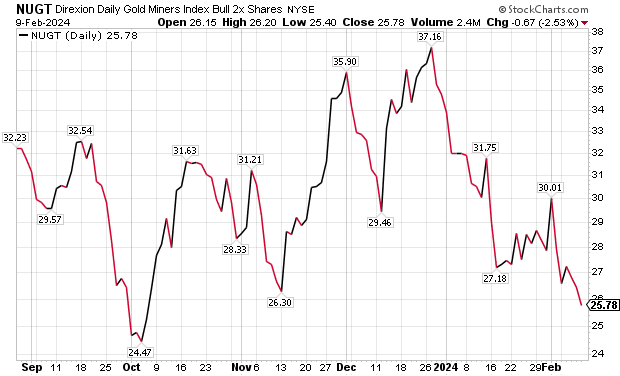 With many analysts and investment firms forecasting that forecasts that gold, the bullish strategy appears most relevant for the next 12 months. The bullish ETF is Direxion Daily Gold Miners Index Bull 2X Shares (NYSE ARCA: NUGT). The ETF to use to profit is gold mining stocks fall is Direxion Daily Gold Miners Index Bear 2X Shares (NYSE ARCA: DUST. The following cautionary words pertain to both strategies.