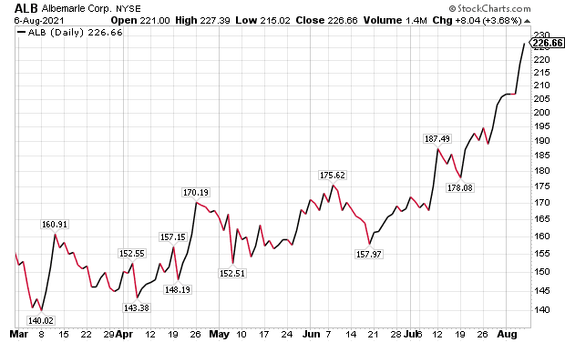 Dividend-paying Albemarle (NYSE:ALB) is the world’s largest miner of lithium, which serves as the main ingredient in batteries used by electric vehicles (EVs). As I have written in past columns, electric vehicle manufacturers such as Palo Alto, California-based Tesla (NASDAQ:TSLA), Detroit-based General Motors (NYSE:GM), Dearborn, Michigan-based Ford (NYSE:F) and Volkswagen AG (FRA:VOW), of Wolfsburg, Germany, seem destined to remain major competitors in the future of transportation.