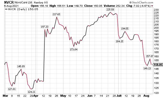 Israel-based Novocure (Nasdaq: NVCR) offers a novel therapy for treating solid tumor cancers and jumped more than 162 points, or 274%, from the end of June 2020 to June 2021. It still is recommended by Green, even though the stock stumbled recently after its Phase 2 trial results to treat advanced liver cancer patients.
