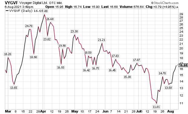 However, the stock generally trades in the same direction as Bitcoin, so Voyager Digital has dipped along with the cryptocurrency recently, Woods said. However, Voyager Digital could become a big winner, despite its volatility, Woods told me. For the past three years, VYGVF is up 13,480%.