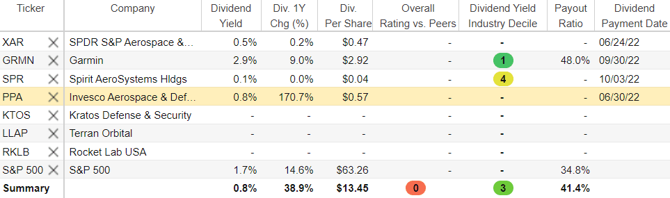 SPDR Aerospace and Defense owns 34 stocks and has 36% of the fund in its 10 largest positions. Those holdings include Boeing (NYSE: BA), Virgin Galactic (NYSE: SPCE) and Huntington Ingalls (NYSE: HII).