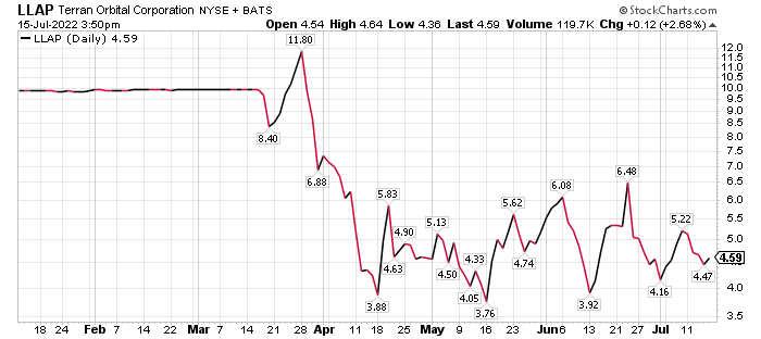 The company begin trading on the New York Stock Exchange in late March under the ticker symbol LLAP, based on the words Live Long and Prosper, the Vulcan greeting from the Star Trek television series. A merger with a special purpose acquisition company (SPAC), Tailwind Two Acquisition Corp., and Terran Orbital was completed March 25, following a shareholder vote.
