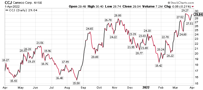 The multinational nuclear conglomerate accounts for nearly one-quarter of the ETF’s assets and has an “outsized influence” on the fund’s total performance, Woods said. He liked Cameco well enough to recommend it recently in the Fast Money Alert trading service that he heads with his co-editor, Mark Skousen, PhD.