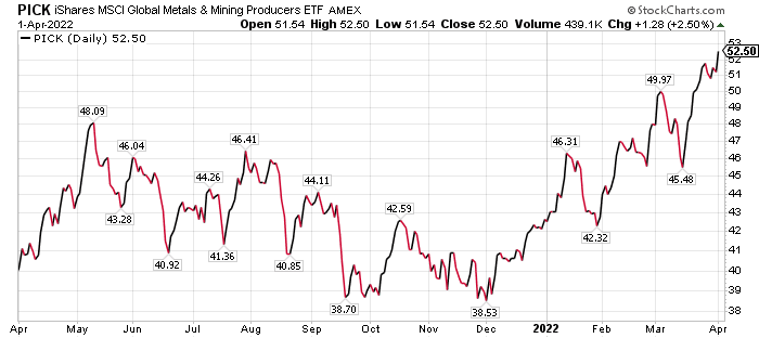PICK provides exposure to worldwide mining and production of diversified metals, except for gold and silver. The investment rationale is to buy a basket of diversified metals — many of them necessary for manufacturing — as an inflation hedge.