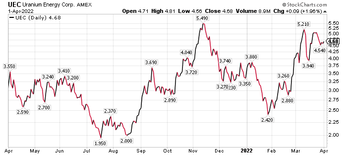 Plus, UEC has other diversified holdings of uranium assets. They include one of the largest physical uranium portfolios of U.S. warehoused U3O8; a major equity stake in the only royalty company in the sector, Uranium Royalty Corp (NASDAQ: UROY); and a pipeline of resource-stage uranium projects in Arizona, Colorado, New Mexico and Paraguay.