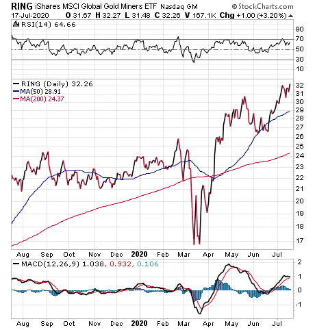 “When it comes to the risk-off trade, it’s all about finding quality safe havens proven to protect capital,” said Jim Woods, editor of the Intelligence Report, Successful Investing and Bullseye Stock Trader advisory services. “Gold is one of my preferred safety trades, and specifically mining stocks in the iShares MSCI Global Gold Miners ETF (NASDAQ:RING).”