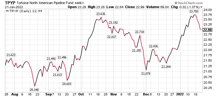 For investors interested specifically in energy services, Carlson recommends an exchange-traded fund (ETF), Tortoise North American Pipeline (TPYP).  It seeks to follow a custom index called the Tortoise North American Pipeline Index.