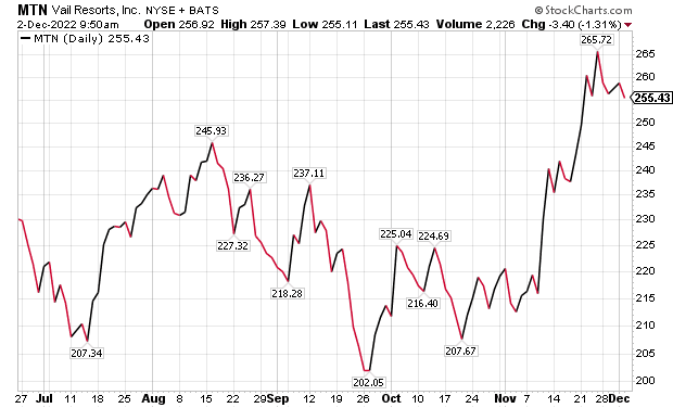 - Strong growing revenues in a softening economy. Despite MTN increasing ticket prices 7.5%, the company’s revenue from ski passes was already up 7% for the year through the end of September 2022.